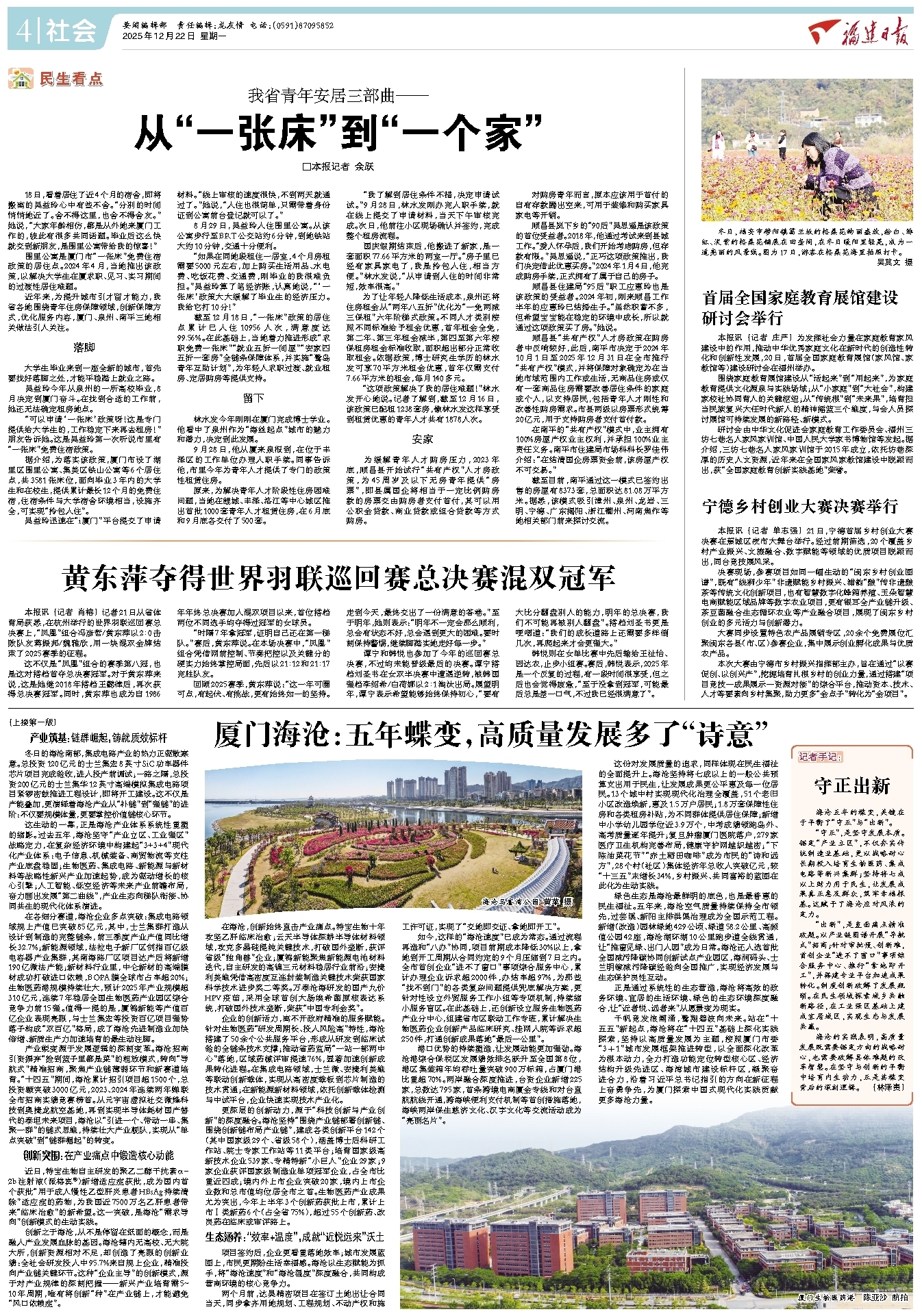 截至12月18日,“一张床”政策的居住点累计已入住10956人次,满意度达99.56%。在此基础上,当地着力推进形成“求职免费一张床”“就业五折一间屋”“安家四五折一套房”全链条保障体系,并实施“鹭岛青年互助计划”,为年轻人求职过渡、就业租房、定居购房等提供支持。