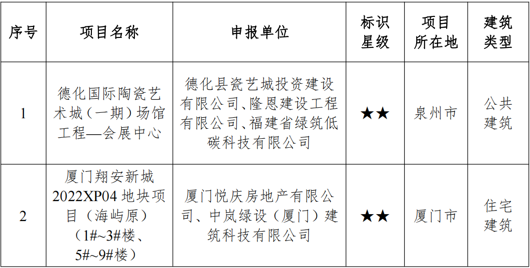 按照《绿色建筑标识管理办法》(建标规〔2021〕1号)和《福建省绿色建筑标识管理实施细则》(闽建〔2022〕7号)有关规定,欲漫涩 组织开展了2025年度第三批二星级绿色建筑标识项目认定工作。经项目单位申报、项目所在设区市住房和城乡建设主管部门推荐、欲漫涩 组织专家评审并向社会公示,确定德化国际陶瓷艺术城(一期)场馆工程—会展中心、厦门翔安新城2022XP04地块项目(海屿原)(1#~3#楼、5#~9#楼)2个项目获得二星级绿色建筑标识,现予公布。