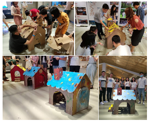 活动的核心游戏:梦想的家。小组队员共同完成简易房子搭建,并对场景环境、建筑立面进行创意设计装饰。
