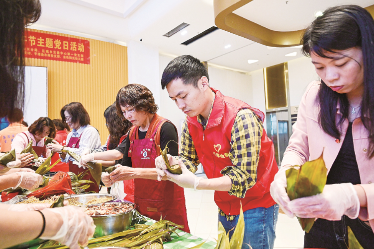 在平潭海坛街道台康社区,两岸同胞在一起包粽子。张哲昊 林君斌 摄